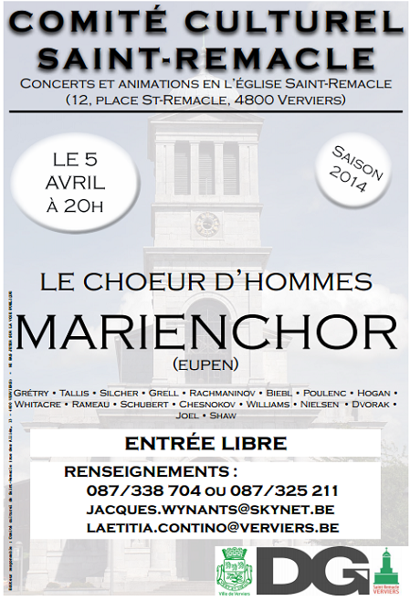 jeudi 20 mars 2014 Verviers, Saint-Remacle, 5 avril, concert par le Marienchor Tweet IMPRIMER Share Lien permanent Catégories : Actualité, Art, Belgique, conférences, spectacles, manifestations, Culture 0 commentaire