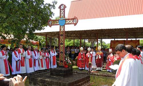 Pour Mgr Olivier Schmitthaeusler, 44 ans, vicaire apostolique de Phnom Penh, et les évêques des deux autres circonscriptions ecclésiastiques du Cambodge, c’est l’aboutissement d’une démarche entreprise il y a quinze ans, lorsqu’en l’an 2000, en réponse à l’appel du pape Jean-Paul II de faire mémoire des martyrs et de tous ceux qui avaient souffert pour leur foi au cours du XXe siècle (1), un mémorial dédié aux martyrs du Cambodge avait été inauguré à Taing Kauk (Tang Kok), bourgade rurale chère au cœur de la petite communauté des chrétiens de ce pays.